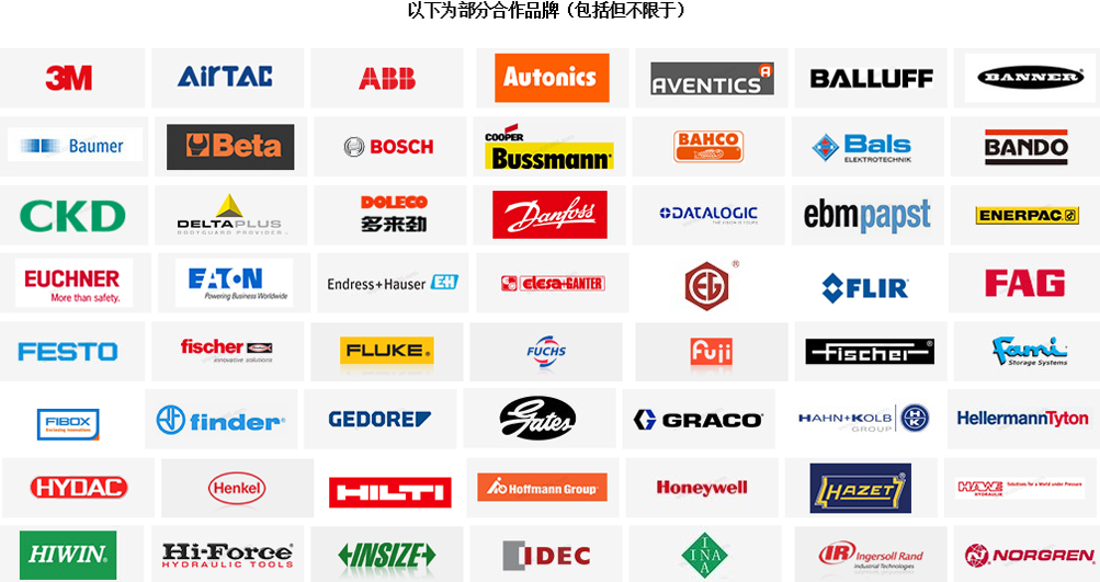 | 配电/工控自动化 | ABB、AUTONICS奥托尼克斯、BALS霸士、BALLUFF巴鲁夫、BUSSMANN巴斯曼、BULL公牛、CNC长城电器、 CHINT正泰、DELIXI德力西、EMERSON艾默生、FIBOX菲宝斯、FUJI富士、IDEC和泉、LAPP缆普、LS产电、 KSS凯士士、MENNEKES曼奈柯斯、MITSUBISHI三菱、MW明纬、OMRON欧姆龙、PANASONIC松下、 PHOENIX CONTACT菲尼克斯、PILZ皮尔兹、QIFAN起帆、SCHNEIDER施耐德、SICK西克、SIEMENS西门子、 DELTA台达、HARTING浩亭、BECKHOFF倍福、WEINVIEW威纶通、MIRO茗熔、BAUMER堡盟、PEPPERL+FUCHS 倍加福、KEYENCE基恩士、IFM易福门、TURCK图尔克、WAGO德国万可、TROJAN邱健、REXROTH力士乐、 PROFACE普洛菲斯、VARTA瓦尔塔、SCHMERSAL施迈赛、Weidmüller魏德米勒、YASKAWA安川 |